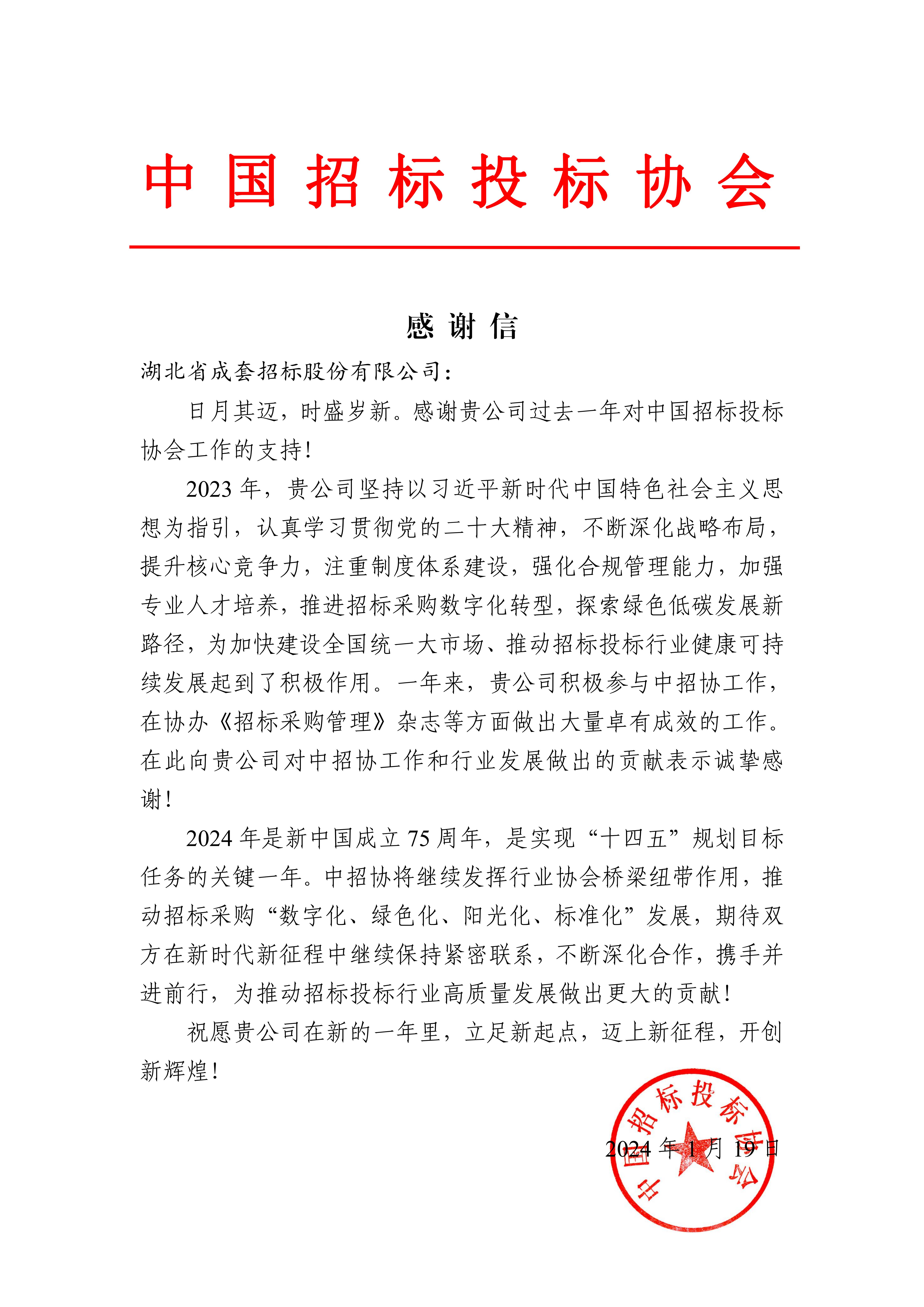 近日,成套公司收到來自中國招標投標協會(下稱“中招協”)的感謝信,就公司作為協會的常務理事單位,為中招標工作和行業發展做出的貢獻表示感謝。