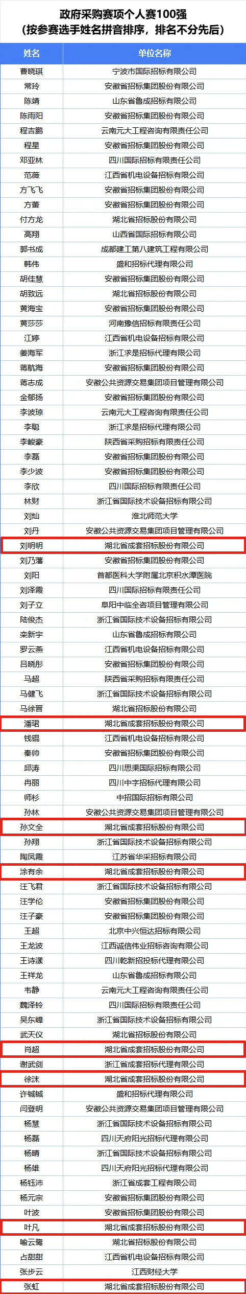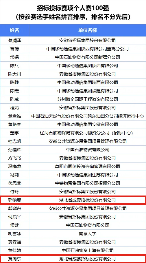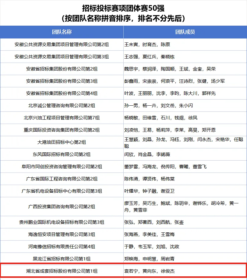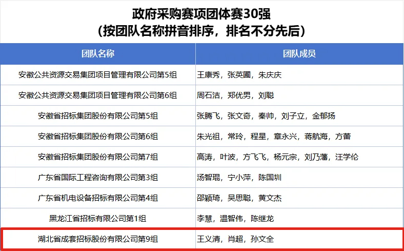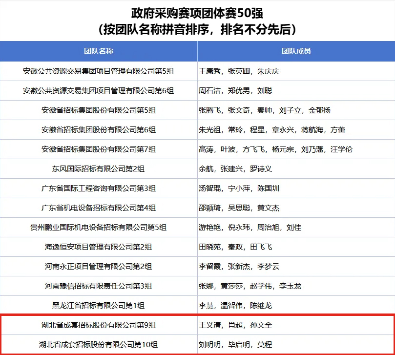 公司第一組團(tuán)隊(duì)袁若寧、黃向東、徐俊杰入圍全國(guó)招標(biāo)投標(biāo)賽項(xiàng)團(tuán)體賽50強(qiáng)榜單;公司第九組團(tuán)隊(duì)王義清、肖超、孫文全入圍全國(guó)政府采購(gòu)賽項(xiàng)團(tuán)體賽30強(qiáng)榜單;公司第十組團(tuán)隊(duì)劉明明、畢啟明、莫程入圍全國(guó)政府采購(gòu)賽項(xiàng)團(tuán)體賽50強(qiáng)榜單;公司參賽選手郭涵度、黃向東入圍全國(guó)招標(biāo)投標(biāo)賽項(xiàng)個(gè)人賽100強(qiáng)榜單;公司參賽選手劉明明、潘珺、孫文全、涂有余、肖超、徐沫、葉凡、張虹入圍全國(guó)政府采購(gòu)賽項(xiàng)個(gè)人賽100強(qiáng)榜單。