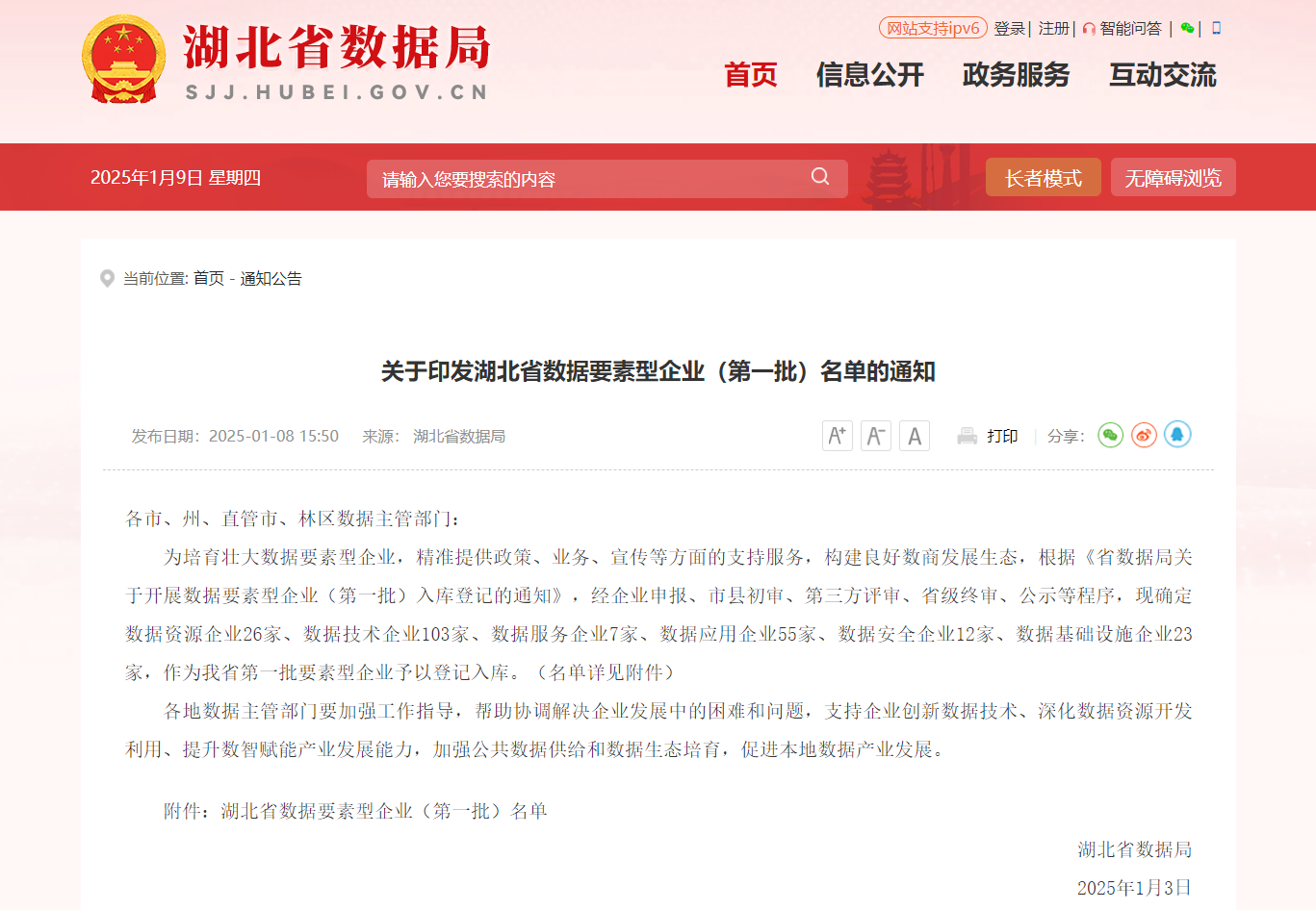 1月8日,湖北省數據局發布湖北省數據要素型企業(第一批)名單,省成套招標公司入選湖北省首批登記入庫的“數據技術企業”和“數據應用企業”。